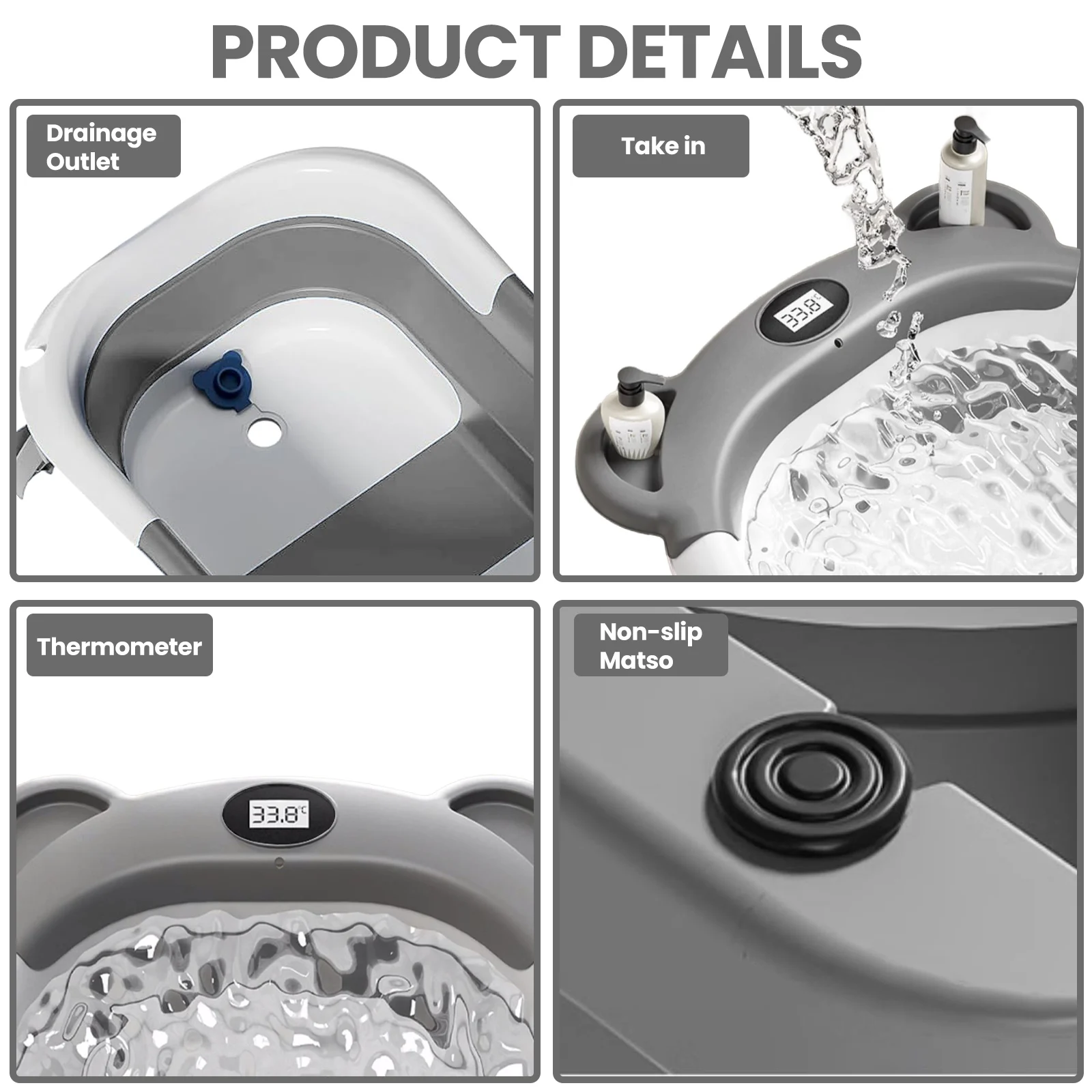 Intelligent Design——Unlike ordinary tubs, our infant bathtub features a real-time temperature sensor, ensuring your baby’s comfort and well-being.The off-the-ground drain with an easy-to-pull rubber plug simplifies water drainage without moving the tub.